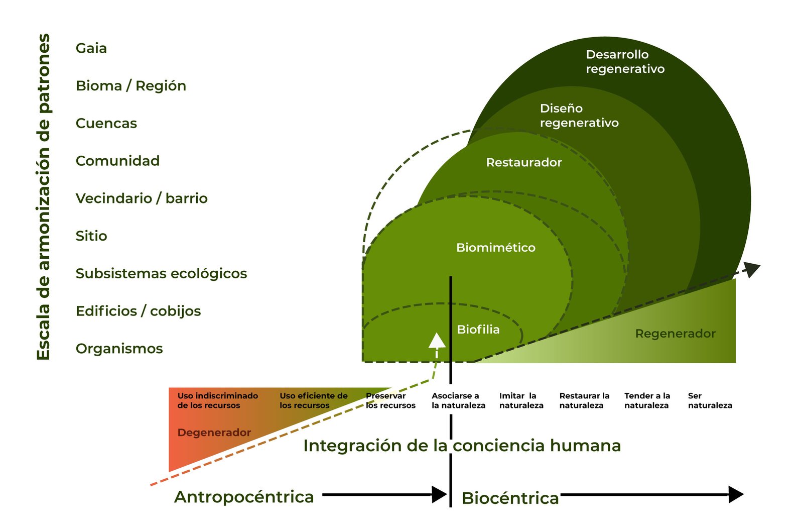 Mientras avanzamos en esa reflexión, aquí les compartimos dos propuestas interesantes de transición desarrolladas por diferentes autores. Una propone una visión macro de ese escenario, mostrando cómo ese contexto se enmarca en diferentes escalas, hasta la integración de la conciencia humana a un plano bio céntrico. La otra hace un zoom en cómo sería esa transición desde la práctica en diferentes eslabones de la cadena de suministro.